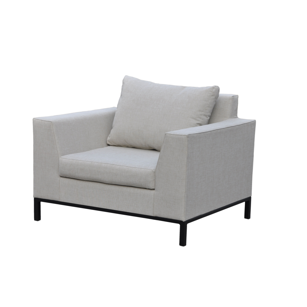 Base en aluminium revêtu de poudre avec coussins en mousse à mémoire de forme à séchage rapide recouverts de housses Sunbrella. Le matériau est hydrofuge, antifongique, protecteur des UV et facile à entretenir.